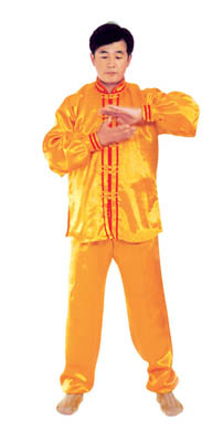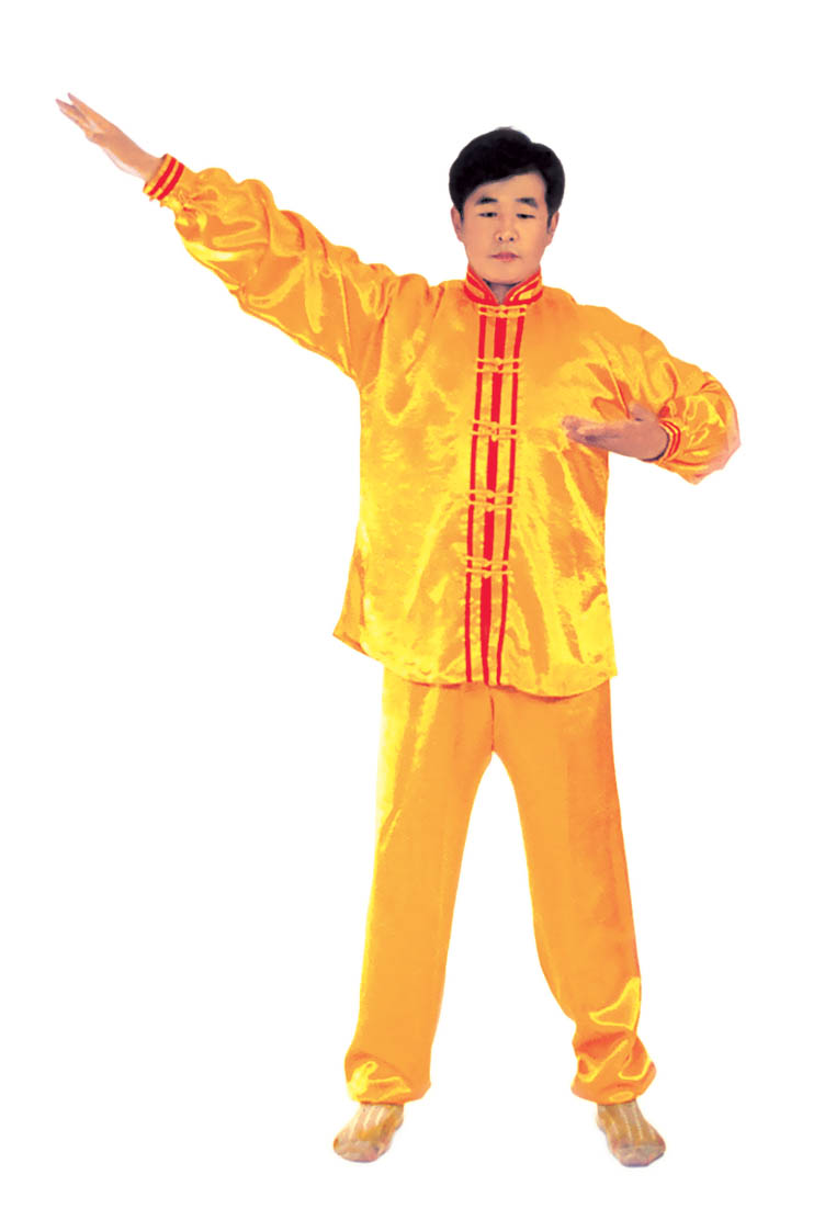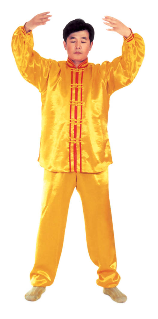 Chưởng chỉ càn khôn[5]: Bắt đầu từ thế “hợp thập”. Hai bàn tay tách ra, cách nhau chừng 2~3cm, đồng thời bắt đầu xoay bàn tay, nam tay trái (nữ tay phải) xoay hướng vào ngực, tay phải hướng ra ngoài ngực, hình thành tay trái ở trên, tay phải ở dưới và cẳng tay giống hình chữ “nhất” (nữ thì trái phải ngược lại), (như hình 1.6) Tiếp theo, cẳng tay trái duỗi thẳng chếch lên bên trái, bàn tay úp xuống, độ cao bàn tay ngang với đầu thì dừng; tay phải đặt chỗ trước ngực, bàn tay ngửa lên. Thuận theo khi tay trái dần dần tới vị trí, thì toàn thân cũng dần dần căng thẳng, đầu dựng lên, chân dẫm xuống. Tay trái duỗi thẳng phía chếch bên trái, tay phải ở trước ngực, bắp tay thẳng hướng phía ngoài (như hình 1.7). Duỗi khoảng 2~3 giây đồng hồ, rồi toàn thân lập tức buông chùng, tay trái lại thu về chỗ trước ngực và cùng với tay phải thành trạng thái “hợp thập”. Sau đó lại xoay bàn tay, triển khai tay phải (nữ tay trái) ở trên, tay trái ở dưới (như hình 1.8). Tay phải lặp lại động tác vừa rồi của tay trái, tức là cẳng tay duỗi chếch sang bên phải, bàn tay úp xuống, bàn tay có độ cao ngang đầu; tay trái vẫn ở chỗ trước ngực, bàn tay ngửa lên. Sau khi duỗi căng xong (như hình 1.9) toàn thân lập tức buông chùng. Thu tay về sau đó hai tay “hợp thập” trước ngực (như hình 1.5)
