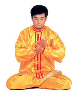 Tu luyện tĩnh công: Tiếp theo tư thế trên, sau đó, tay trên vạch một nửa hình tròn ra phía trước và rơi vào chỗ bụng dưới, hai tay trở thành trạng thái kết ấn (như hình 5.15), tiến nhập vào tu luyện tĩnh công. Nhập định, thời gian càng lâu càng tốt.